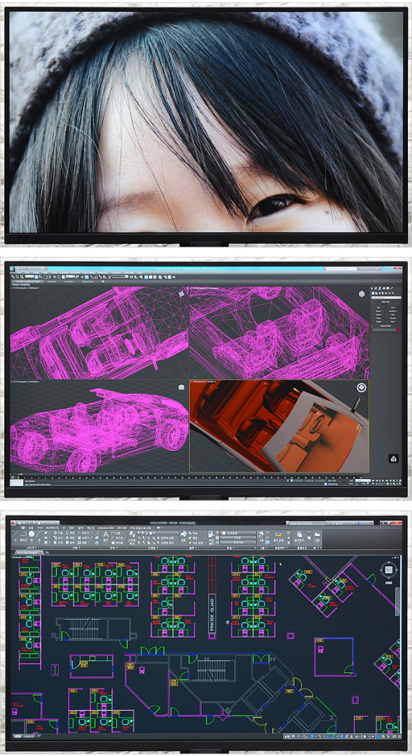 이 제품은 사진편집이나 디자인 뿐만 아니라 높은 디테일을 필요로 하는 캐드나 3D 작업등의 용도로도 활용할 수 있다. 확대시 뭉개져 명확하게 선을 확인하기 힘는 저해상도 모니터와 달리 얇은선 하나하나를 확연하게 구분할 수 있었다.