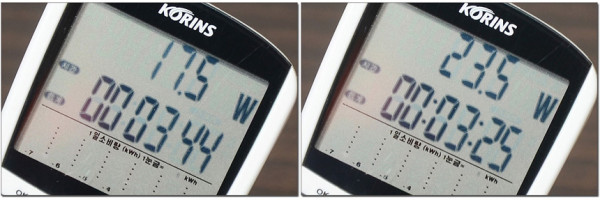 소비전력 테스트를 진행하고 있는 모습으로 대기 상태에서는 0.5W 로 동작했으며 100% 밝기에서는 23.5W, 50% 밝기에서는 17.5W 의 전력이 소모되는 것을 확인할 수 있었다. 낮은 전력소모로 전기세 걱정없이 사용할 수 있을 것이다.