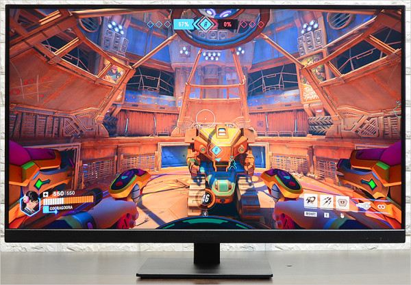 모니터 전면부의 모습으로 32형 대화면에 QHD (2560 x 1440) 해상도를 지원한다. 10억 7천만 컬러에 400cd/㎡ 의 높은 밝기를 지원하는 FAST IPS 패널이 탑재되어 VA나 TN 패널과 비교되는 진한 색감을 보여주며 시야각으로 인한 스트레스 없이 사용할 수 있다. 또한 도입부에서 언급한 것과 같이 sRGB 141%, DCI-P3 100%, AdobeRGB 94% 의 높은 색재현력을 지원해 게임 뿐만 아니라 작업용으로도 활용할 수 있다.